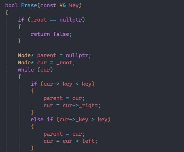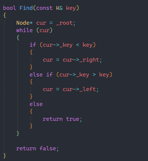 查找的逻辑就更为简单,直接把插入中间那一段拿下来即可。这里就不需要parent了,直接通过cur来找,判断是否存在即可,存在就返回true,不存在就返回false。