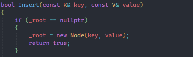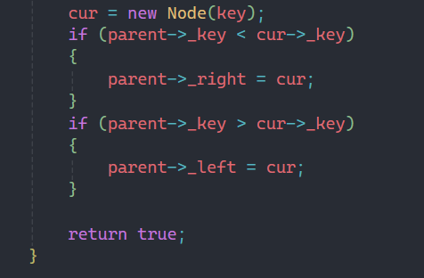 1.这里把插入的返回值设置成bool类型,和之前不同的原因是我们要创建的不含重复值的二叉搜索树,所以要判断是否插入成功。当然不一定非要设置成这样,如果你不想得到这样的反馈,也可以设置为void类型,根据不同的需求做出不同的选择即可。