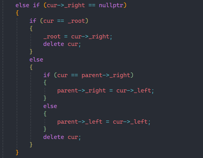 判断完成后如果是右边,那么就让parent的right指向cur的right;如果是左边,那么就让parent的left指向cur的right。