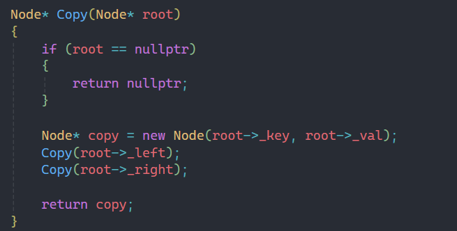 而拷贝构造实现起来也比较简单,我们要利用的是中序递归,先构建根结点,在构建左右子树,最后返回copy,也就完成了拷贝构造功能。