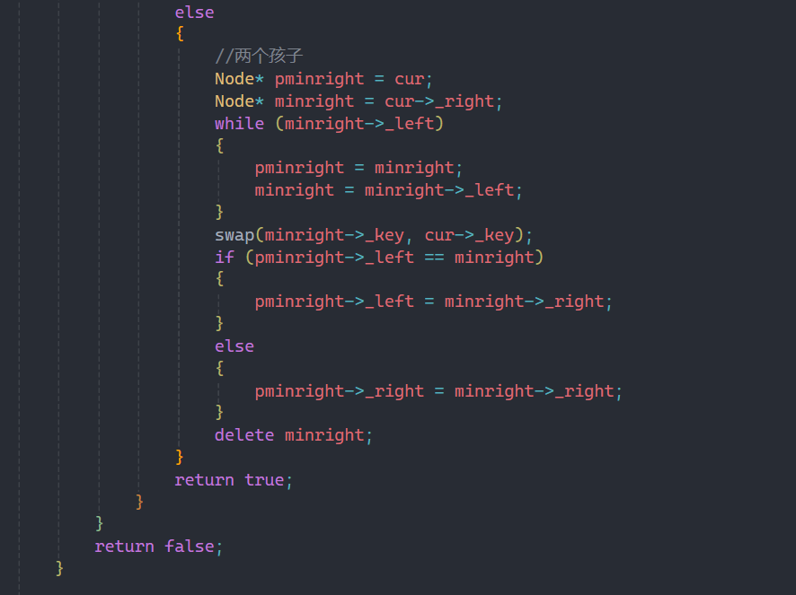 所以基于上面这种情况,我们才要再定义一个pminright,来判断是否右子树第一个结点就是最小结点。如果不是,就说明进入while循环找到相应结点,交换后让pminright的left指向minright的right,最后delete掉minright节点即可;如果是,那么就直接让pminright的right指向minright的right,就是直接跳过minright指向它的右子树,再delete掉minright结点即可。