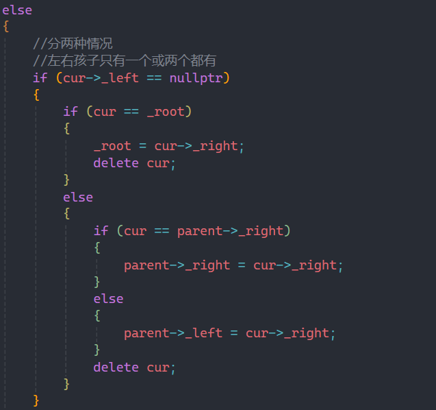 反之如果要删除的不是根结点,那么就要判断此时cur所在的结点是在parent的左边还是右边。