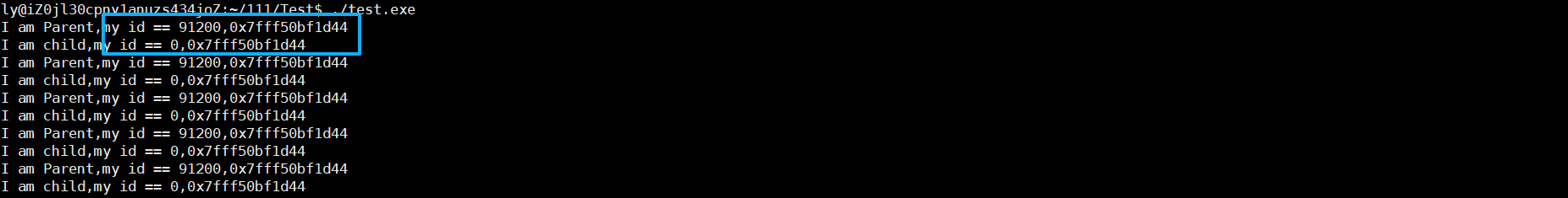 printf("I am child,my id == %d,%p\n",id,&id);