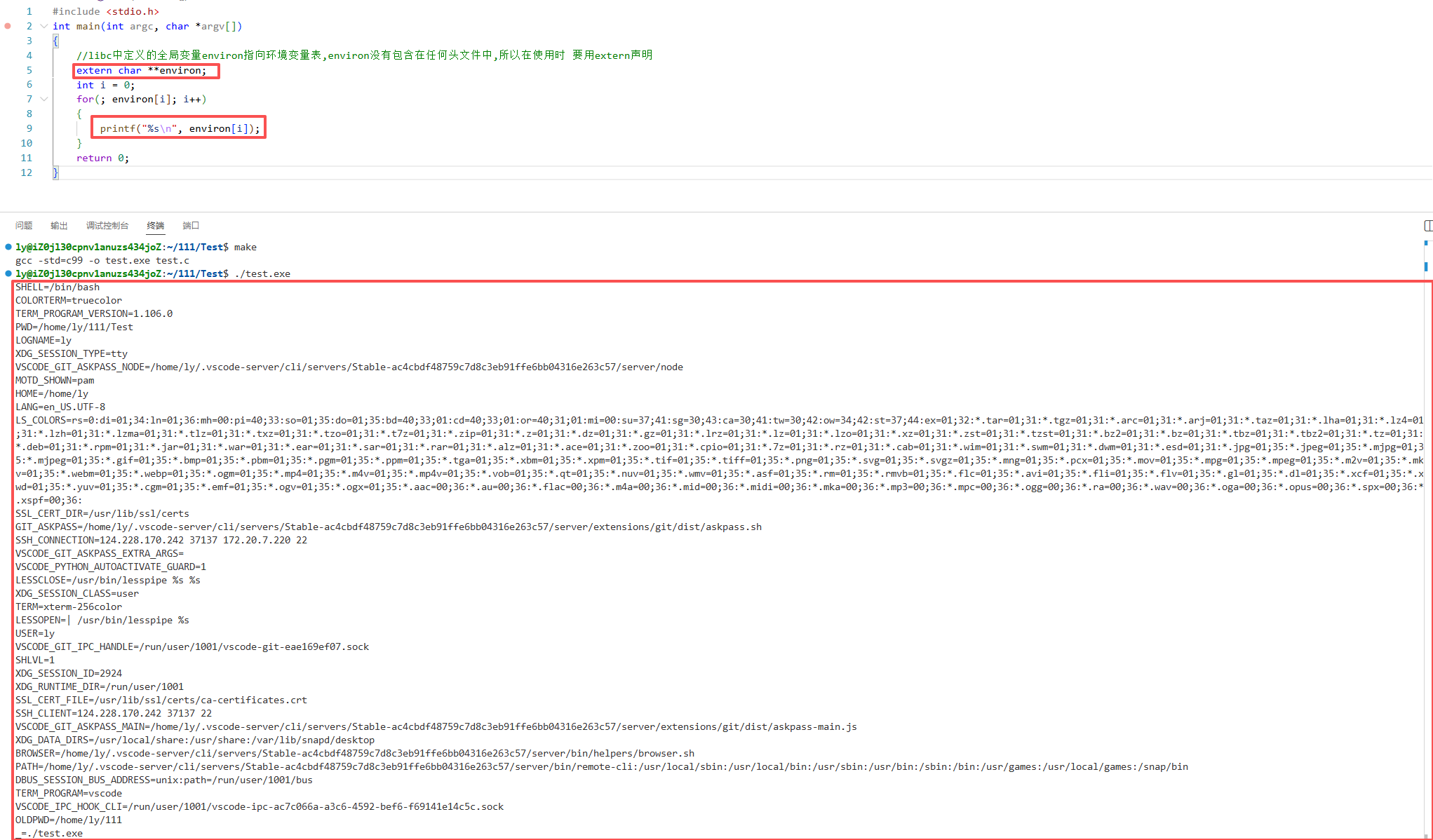 //libc中定义的全局变量environ指向环境变量表,environ没有包含在任何头文件中,所以在使用时 要用extern声明