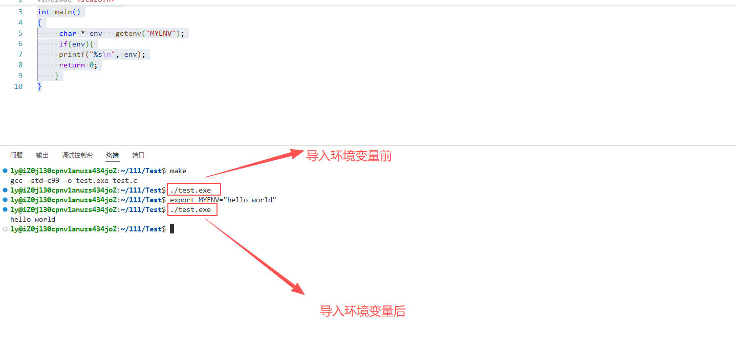 我们可以发现,当将MYENV环境变量导入以后,此时再运行程序就有了,说明环境变量是可以被子进程继承下去的.