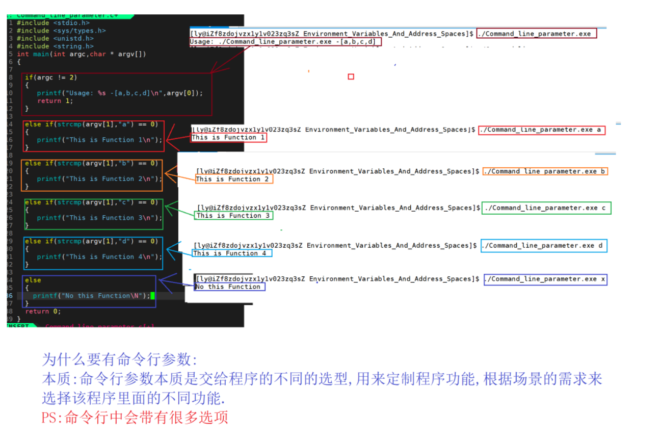 我们可以看到,当输入不同的命令行参数时,会执行不同的功能,所以命令行参数的本质是