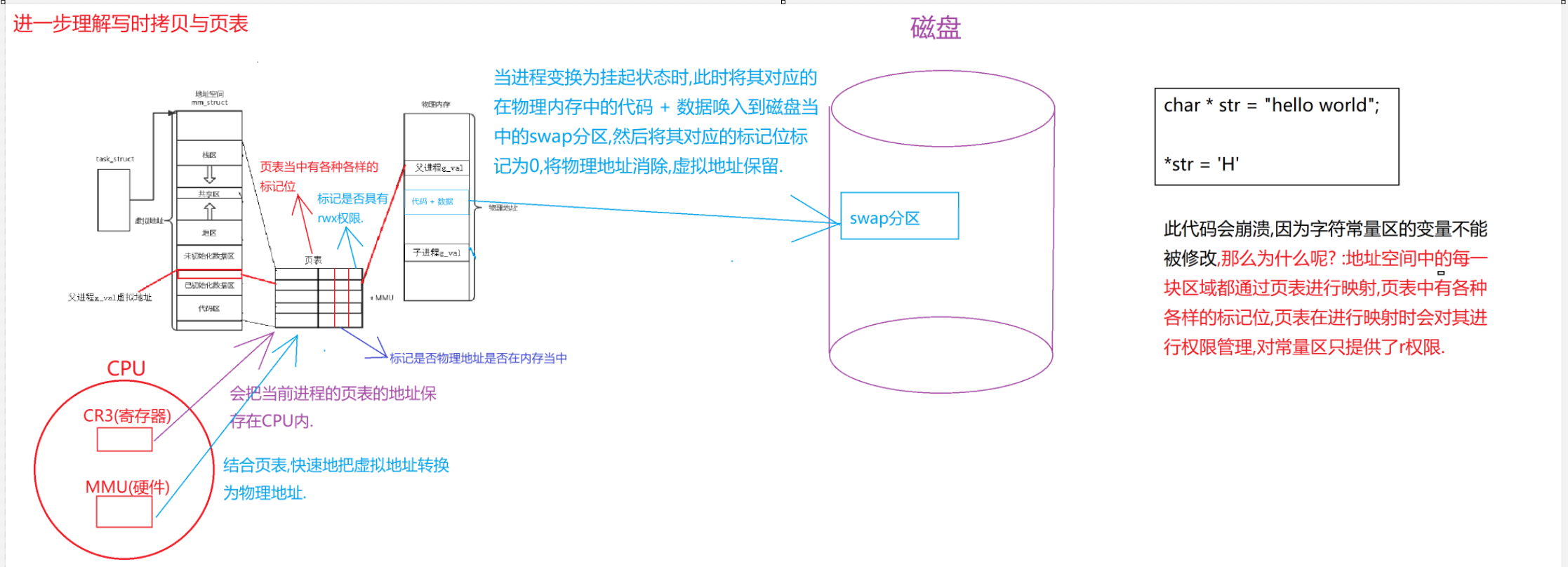 在磁盘中存在一个区域叫做swap分区,这个swap分区呢,是在当进程变换位挂起状态时,此时将其对应的在物理内存中的代码 + 数据唤入到磁盘当中的swap分区,然后将其在页表对应的标记位标记为0,将物理地址消除,虚拟地址保留.