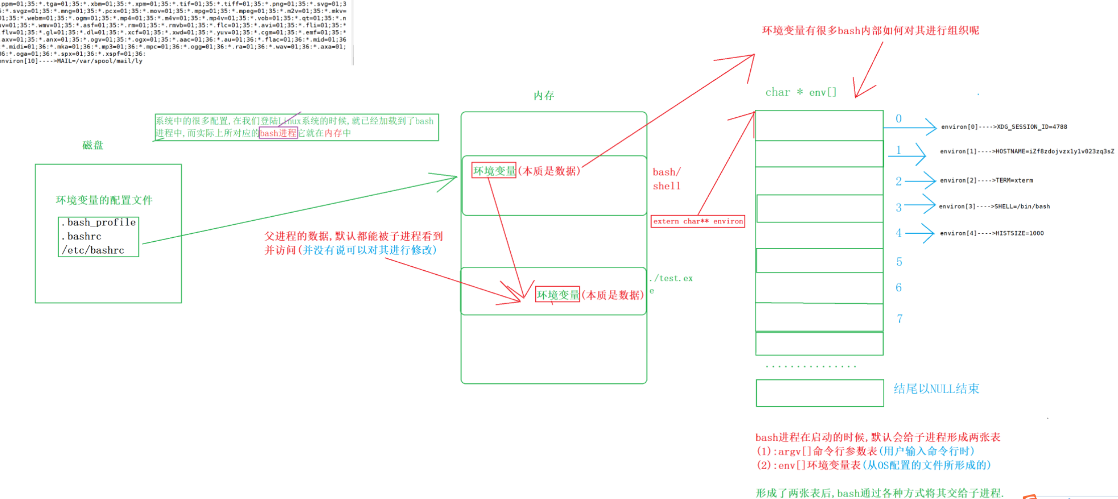 每个程序都会收到一张环境表,环境表是一个字符指针数组,每个指针指向一个以'\0'结尾的环境字符串.并且结尾以NULL结束