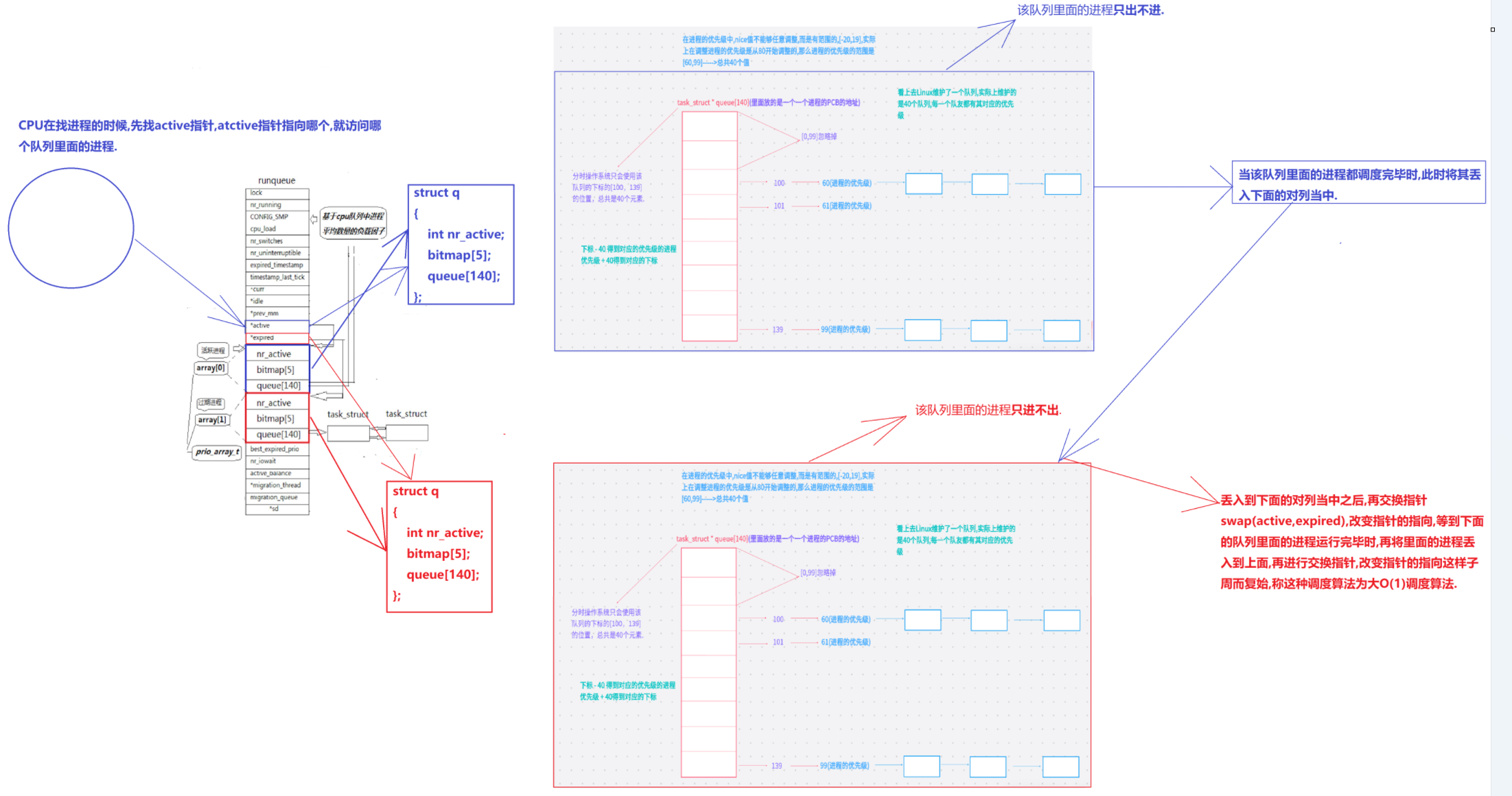 在系统当中查找一个最合适调度的进程的时间复杂度是一个常数,不随着进程增多而导致时间成本增加,我们称之为进程调度O(1)算法!