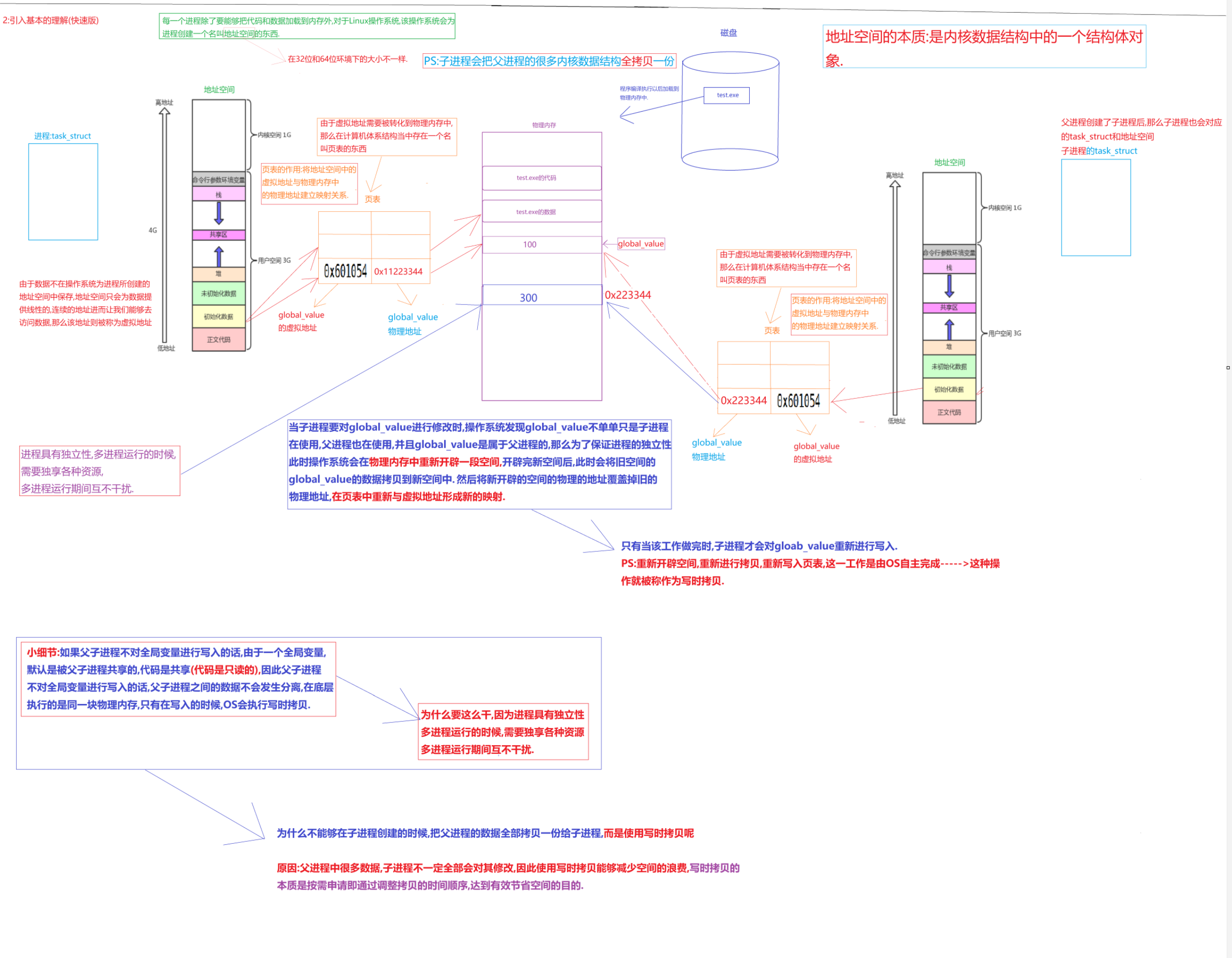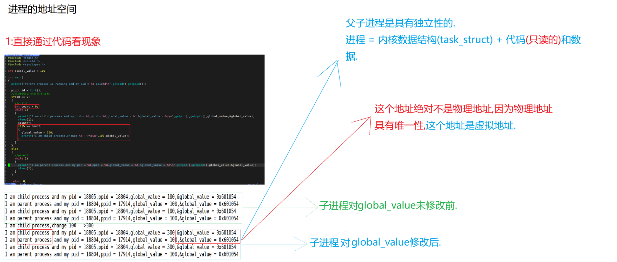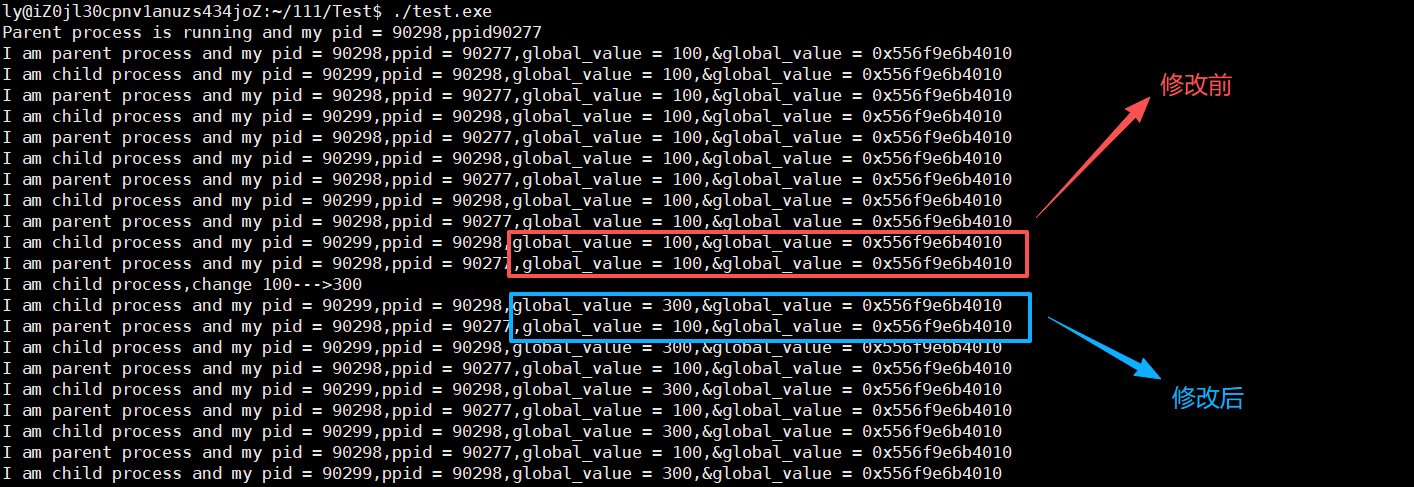 我们可以清晰地看到,在global_value修改前,父子进程输出来的变量值和地址是一模一样的,这个很好理解,因为子进程会以父进程为模板,父子并没有对变量进行任何修改. 但是当子进程对global_value进行修改时,我们会发现输出的地址是一样的,但是变量内容不一样,那么可以得出以下结论: