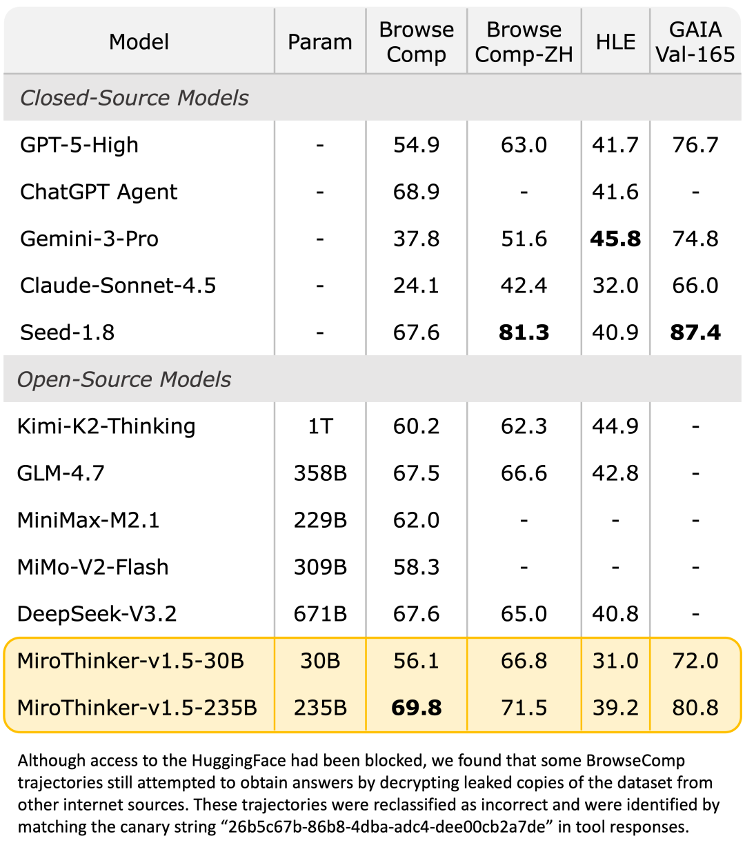 MiroThinker-v1.5-30B 仅用 1/30 的参数规模跑出了比肩众多 1T 模型的性能表现,其 235B 的版本在多个搜索智能体基准测试中跻身全球第一梯队。
