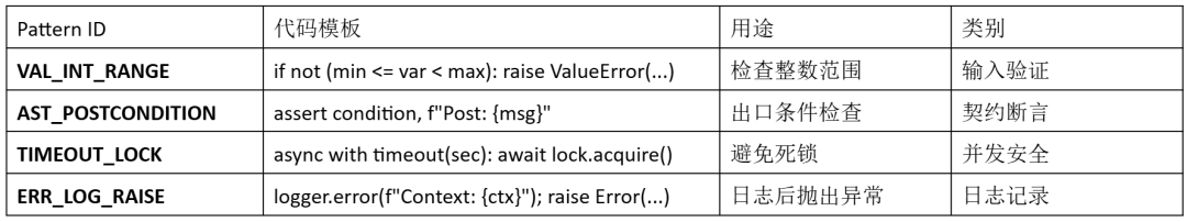 统一的验证模式库: 我们维护了一个包含常用验证模式的库,每个模式都有唯一的 ID 和标准化的实现。这些模式遵循单一定义,多处复用原则。当需要在代码内增加某个验证逻辑时,只需在注释中加入模式库中的一处定义,AI 实施时会按 ID 查表展开,确保整个代码库中相同验证逻辑的一致性。