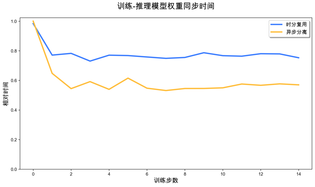 在评估时分复用方案时,我们也仔细分析了引入的系统开销。参数同步开销方面,由于时分复用方案需要在更多的 GPU 之间进行参数同步(160 卡 vs 32 卡),相比分离方案会产生额外的通信开销,但这一开销在整体训练整体时间中占比极小。