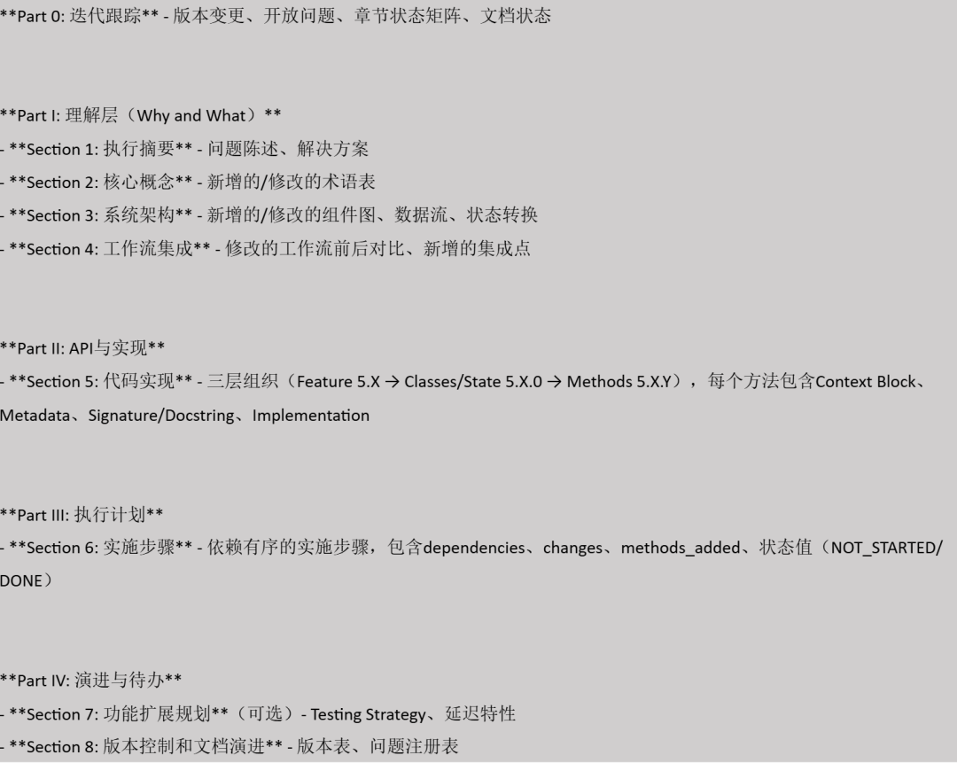 代码实现的结果是由一系列自顶向下的决策决定的,顶层的关键决策包括新功能如何融入已有架构,底层的决策如是否需要增加成员变量。组织设计文档的核心目的是系统性的跟进这些决策点,并逐步完善解决。由于底层的决策,往往依赖于顶层或者上层的决策,设计文档需要层次化的拆解决策,形成决策体系。开发者需要按照章节的先后顺序和目录层次结构审阅文档中的自顶向下的决策过程,当我们指出前面顶层设计的错误时,AI 会自动修改后面章节的中层和下层决策以保持内部逻辑的一致性。因此,我们可以按章节层次和顺序和 AI 逐个对齐自顶向下的决策。同时,在开发者和 AI 共同修正这些决策的过程中文档不断演进,文档需要自包含这个迭代的过程,记录迭代的版本。最后,文档也需要记录代码实施的进度和一些衍生的待办。