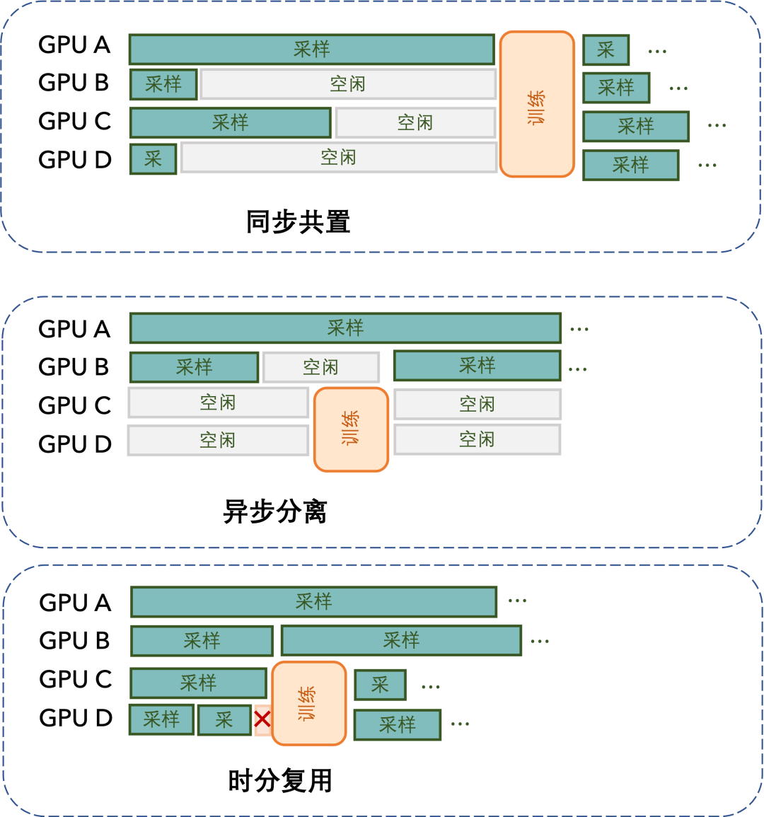 共置方案采用严格的串行执行策略:所有 GPU 首先统一投入 rollout 阶段,等待全部样本采样完成后再切换至 training 模式。这种方案存在双重效率问题。首先是阶段内的资源闲置:在 rollout 阶段,由于落后者效应的存在,大量 GPU 在短样本完成后进入闲置等待状态,无法有效利用。其次是阶段间的严格串行限制:rollout 和 training 完全无法并行执行,training 阶段必须等待 rollout 完全结束才能开始,导致整体迭代时间被显著拉长。