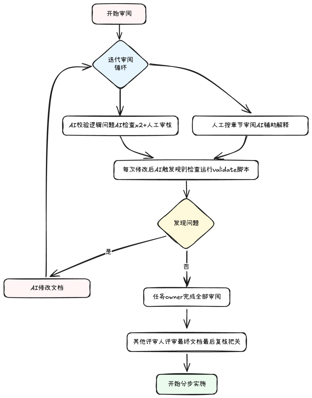 设计文档的审阅是一个迭代优化的过程,需要人和 AI 协作来确保文档质量。我们建立了系统化的审阅流程,通过多轮迭代逐步完善设计文档,直到达到实施标准。