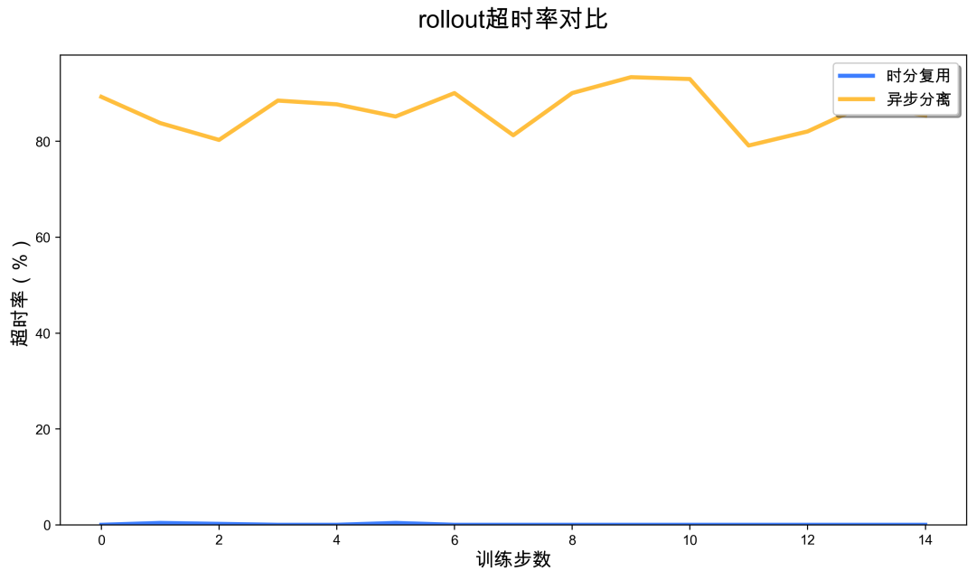 更值得关注的是任务完成率的提升。在 baseline 的完全分离方案中,由于 rollout 资源受限(仅 32 卡),导致采样速度较慢,大量任务触发了环境默认的超时限制,采样轨迹的 timeout 比例居高不下。而时分复用方案通过动态释放更多 GPU 资源用于 rollout,显著加快了采样速度,完全避免了 timeout,提升了整体训练的稳定性和样本利用效率。