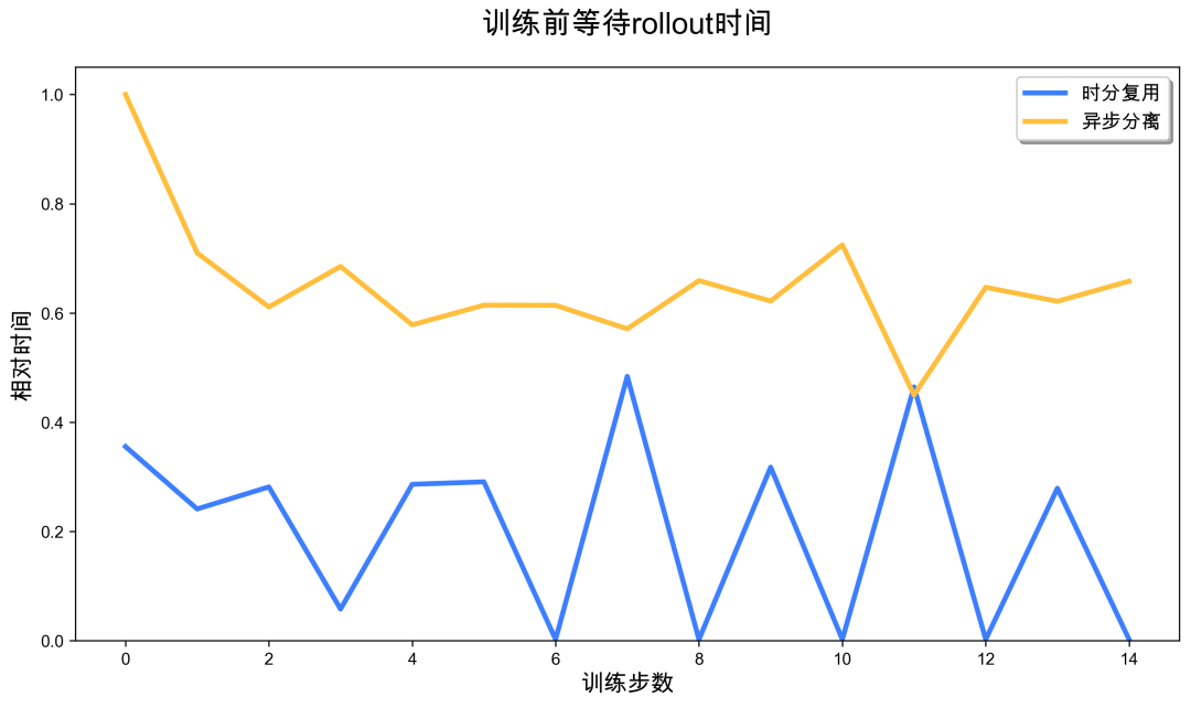 实验结果显示时分复用的 rollout 吞吐率提升了 3.5 倍。时分复用方案的 rollout 阶段几乎始终比完全分离的 baseline 要快,甚至在某些情况下训练任务无需等待 rollout 即可开始,性能提升明显。