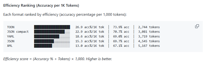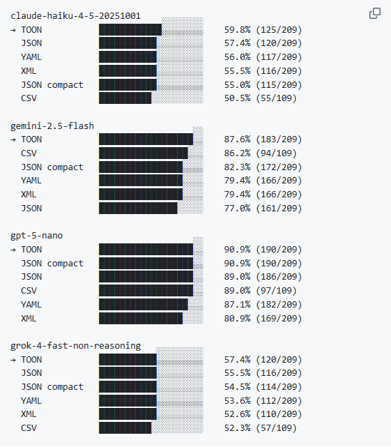 但就小瓜的经历而言,大模型的计数能力普遍较弱,TOON 在第一行就写明了一共有多少条数据条目,12%的结构意识题目确实不是给 TOON 开后门?但是 CSV 表现又不太好,由于没有完全公开数据集和测试集,对于这部分官方测评小瓜仍持保守态度。