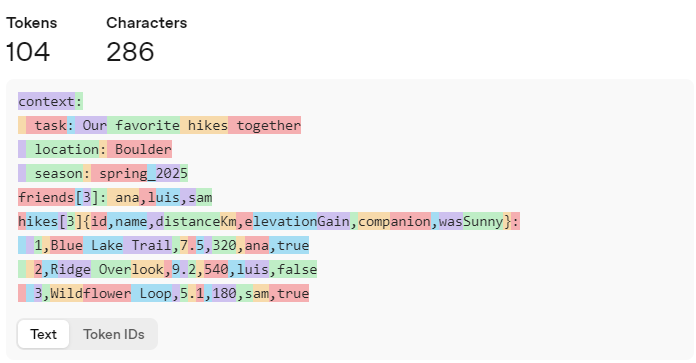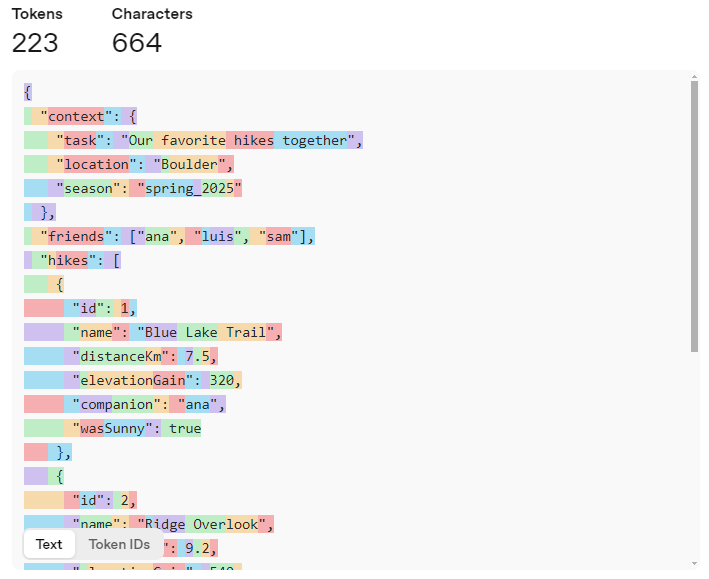 官方提供的效率、检索准确度排名相对缥缈,但是 token 差异是我们确实能看得见摸得着的,我们利用 OpenAI 提供的 tokenizer 工具来统计一下 token 差异。 网址:[https://platform.openai.com/tokenizer](https://platform.openai.com/tokenizer) 测试数据:// JSON