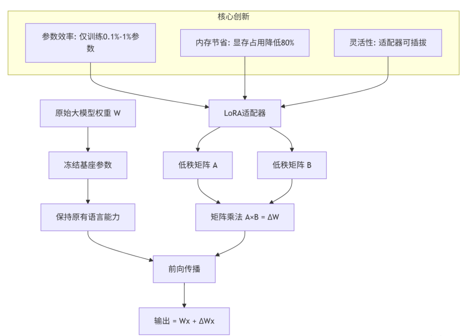 传统微调就像给房子重新装修——得把墙都砸了重来。LoRA的思路完全不同:房子不动,只加智能家居。它在大模型的权重矩阵旁边加两个小矩阵(A和B),通过低秩分解实现参数高效更新。
