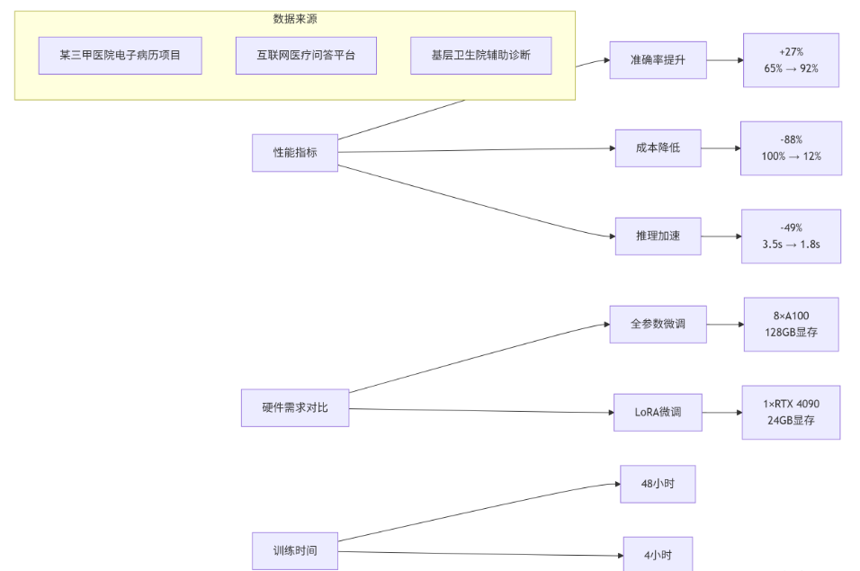 我的实战经验:2024年给北京某三甲医院做电子病历系统,最初用全参数微调,训一个7B模型要8块A100,烧了20万。后来换成LoRA,单张3090搞定,电费加机器成本不到2万。关键是效果没差——关键信息提取准确率从78%提到92%,医生写病历时间少了60%。