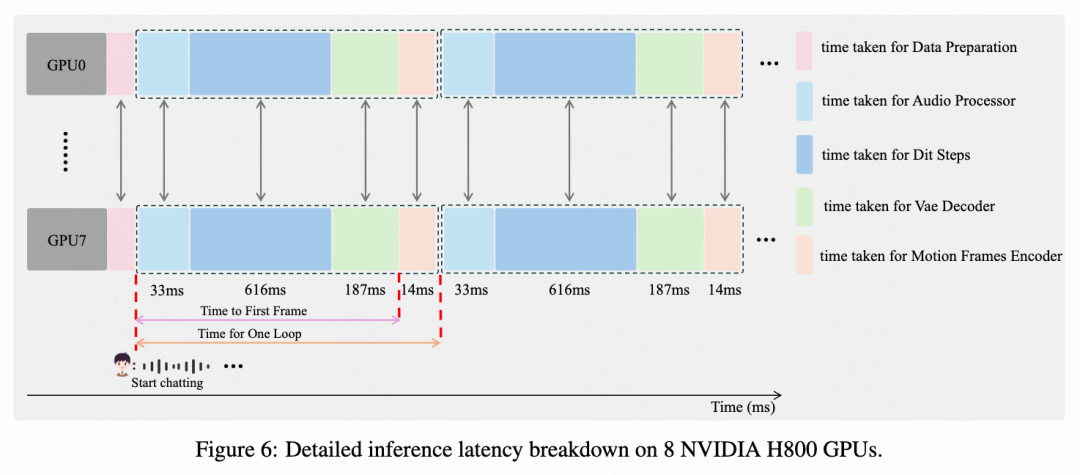 在核心组件优化基础上,本文报告了8个H800 GPU集群上端到端流水线延迟,如下图6所示。在稳态生成循环期间,每个周期的总延迟为876毫秒,其中音频处理耗时33毫秒,核心4步DiT去噪耗时616毫秒,帧解码耗时187毫秒,运动帧编码耗时14毫秒。其余延迟归因于其他开销。通过实现亚秒级的端到端延迟,所提出的流水线满足了实时流媒体严格的吞吐量要求。