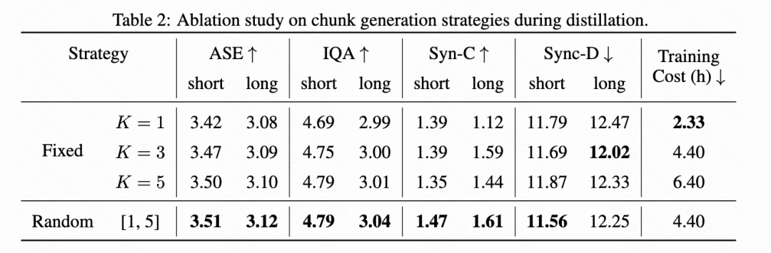 如下表2所示,单块 训练的训练成本最低(2.33小时),但无法保持长期稳定性,长视频上的Sync-C得分仅为1.12,证实了误差累积问题。将 增加到3显著提高了稳定性。然而,将 进一步增加到5会将训练成本提高到6.40小时,但同步性能没有相应提升。随机策略达到了最佳的整体平衡,实现了最高的长Sync-C得分1.61和最佳的视觉质量指标,同时将训练成本保持在适度的4.40小时。这表明在蒸馏过程中使模型接触不同自回归长度可有效提高对累积误差的鲁棒性。
