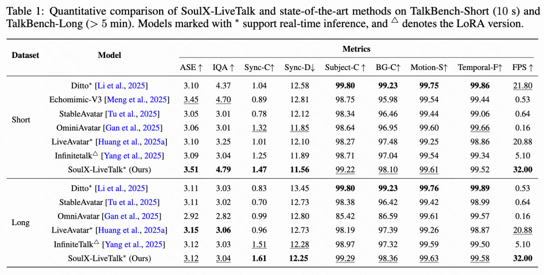 本文将SoulX-LiveTalk与Ditto、EchoMimic-V3、StableAvatar、OmniAvatar、InfiniteTalk和LiveAvatar等最先进的音频驱动生成模型进行了比较。
