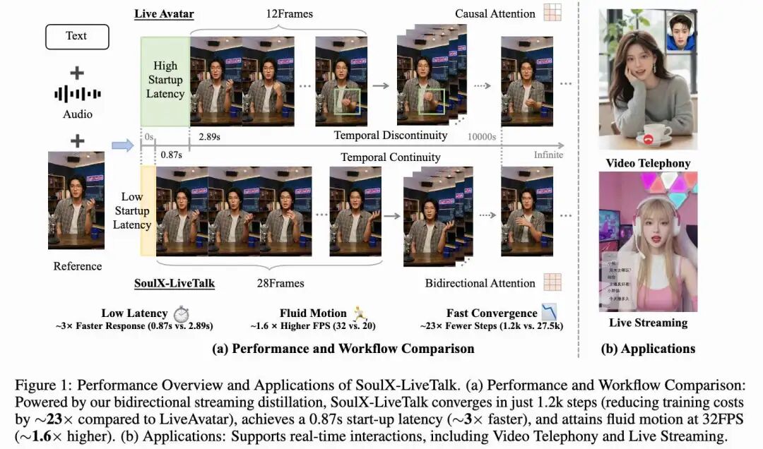 SoulX-LiveTalk,一个旨在满足实时要求同时保持高质量视频合成的框架。该框架将双向流媒体蒸馏与多步自校正机制相结合,使本文的14B参数DiT模型能够在8个H800集群上维持稳定、无限长的流媒体。本文的方法还简化了训练,证明了不需要复杂的多阶段预训练。简短的SFT阶段后进行分布匹配蒸馏就足以实现最先进的性能。