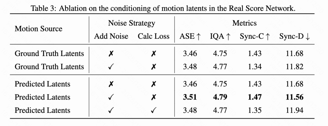 本部分从运动隐变量来源、噪声注入和损失计算三个维度考察了Real Score网络的条件设置。如下表3所示,使用学生预测的运动隐变量比使用真实值(GT)隐变量能产生更好的视觉质量。具体而言,带有噪声的预测策略的ASE为3.51,IQA为4.79,超过了GT配置(3.48和4.77)。这表明使用预测隐变量有助于减少训练和推理之间的差异。