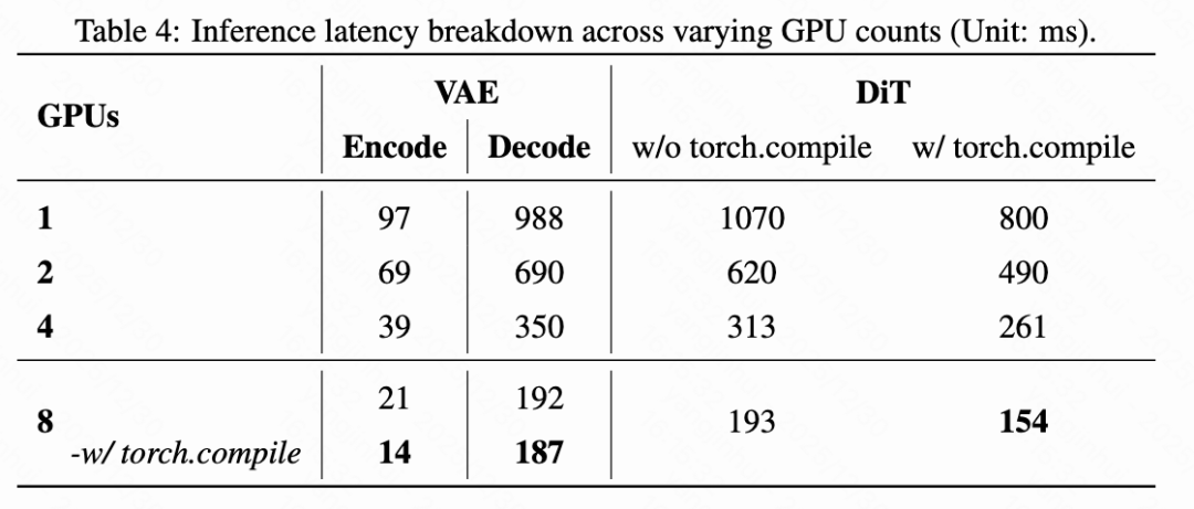 首先检查VAE和DiT的延迟,以突出多GPU并行化的必要性,如下表4所示。在单个GPU上,DiT推理本身每步产生1070毫秒的延迟,而VAE推理编码运动帧需要97毫秒,解码生成帧需要988毫秒。