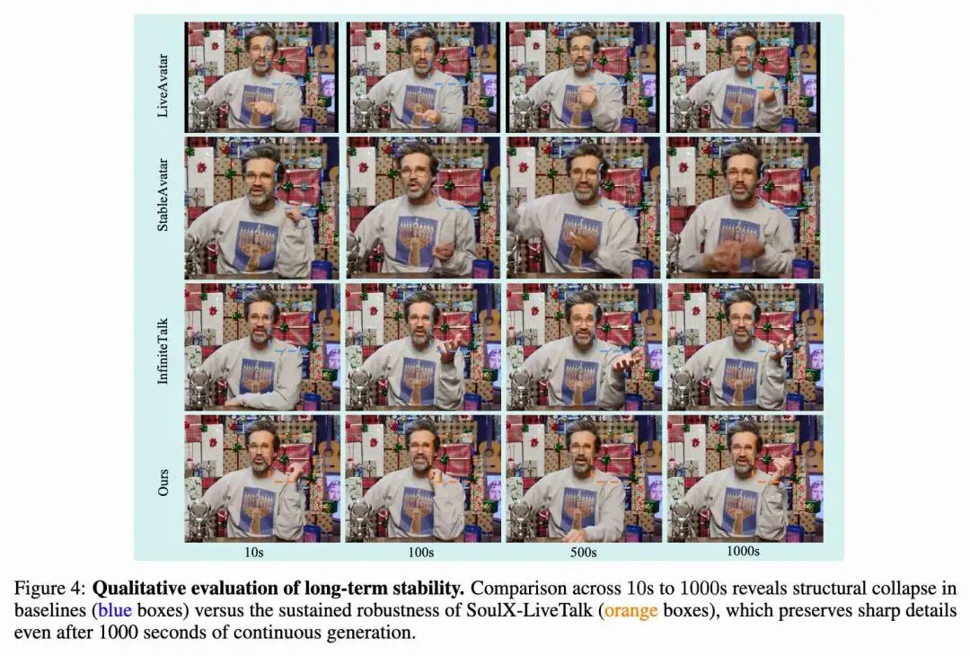 在长周期生成方面,SoulX-LiveTalk的Sync-C达到1.61,Sync-D为12.25,优于InfiniteTalk和LiveAvatar,并保持32 FPS的吞吐量。这些结果证实了双向蒸馏策略能有效减少单向流媒体模型中常见的不同步和漂移问题。