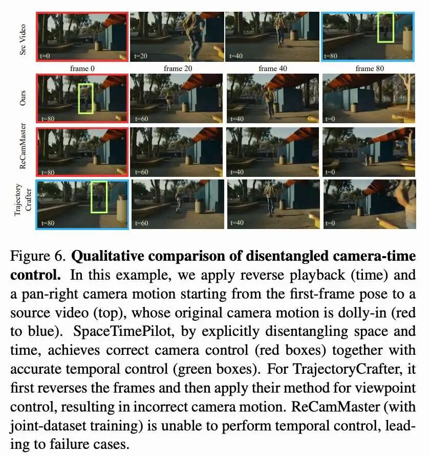 除了定量评估,本文还通过视觉示例展示了 SpaceTimePilot 的优势。如下图 6 所示,只有本文的方法正确合成摄像机运动(红色框)和动画时间状态(绿色框)。ReCamMaster 虽然能很好地处理摄像机控制,但无法修改时间状态,例如实现反向播放。相比之下,TrajectoryCrafter 被反向帧混洗所迷惑,导致最后一个源帧的摄像机姿态(蓝色框)错误地出现在生成视频的第一帧中。更多视觉结果可见下图 5。