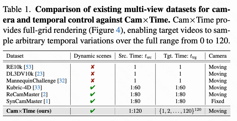用于精确时空控制的合成 Cam×Time 数据集。虽然本文的时间扭曲增强鼓励空间和时间因素之间强烈的解耦,但实现细粒度和连续控制——即平滑精确地调整时间动态——受益于系统覆盖这两个维度的数据集。为此,本文构建了 Cam×Time,一个新的在 Blender 中渲染的合成时空数据集。给定摄像机轨迹和一个动画主题,Cam×Time 详尽地采样摄像机-时间网格,捕获跨越不同摄像机视角和时间状态组合 的每个动态场景,如下图 4 所示。源视频通过采样密集网格的对角线帧(下图 4(底部))获得,而目标视频通过更自由形式的连续序列采样获得。本文将 Cam×Time 与现有数据集进行比较,如下表 1 所示。虽然如[23, 32, 53]等是具有复杂摄像机路径注释的真实视频,但它们要么不提供时间同步的视频对,要么只提供静态场景对。合成多视图视频数据集提供动态视频对,但不允许训练时间控制。相比之下,Cam×Time 能够对摄像机运动和时间动态进行细粒度操作,从而实现子弹时间效果、运动稳定和灵活的控制组合。本文将 Cam×Time 的一部分指定为测试集,旨在将其用作可控视频生成的基准。本文将发布它以支持未来对细粒度时空建模的研究。