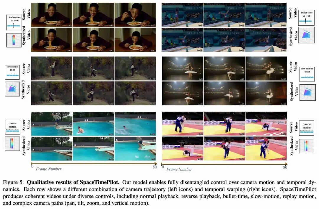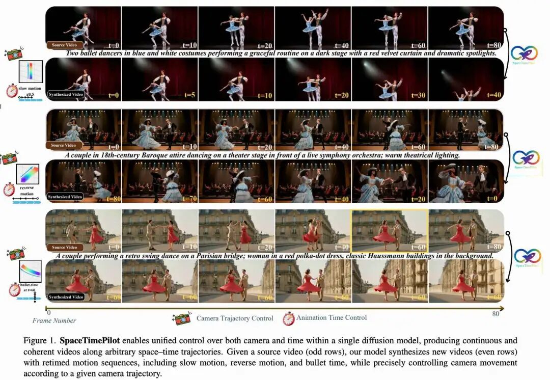 E_cam(c) 编码摄像机轨迹,并进一步结合源感知摄像机条件化,将源视频 和目标视频 的摄像机姿态联合注入模型。本文的方法 SpaceTimePilot 通过在生成过程中解耦空间和时间因素,实现了子弹时间(bullet-time)和从新视点重新计时播放等效果,如上图 1 所示。