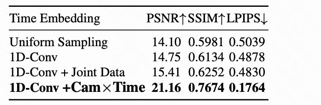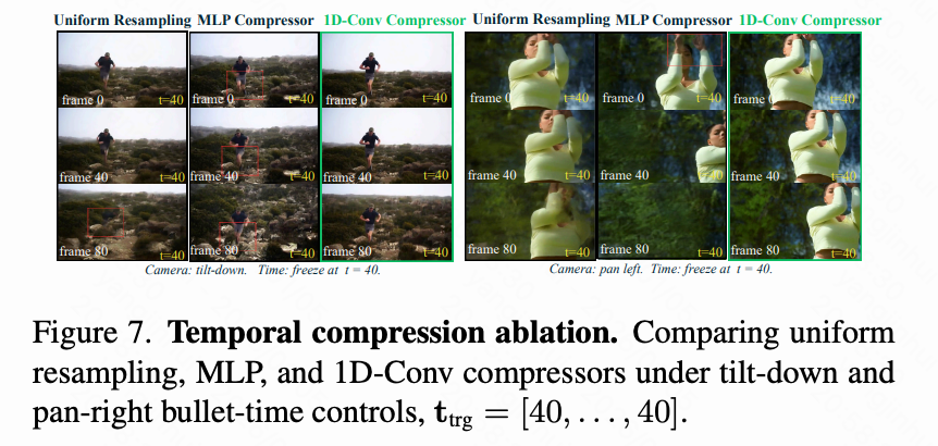 为了验证所提出的时间嵌入模块的有效性,如下表 5 所示,本文遵循上文中的时间控制评估设置,并将本文的 1D 卷积时间嵌入与上文中讨论的几种变体和替代方案进行比较:(1)均匀采样:将 81 帧嵌入均匀采样到 21 帧序列,这等效于在潜在帧 级别采用正弦嵌入;(2)1D-Conv:使用 1D 卷积层从 压缩到 ,并使用 ReCamMaster 和 SynCamMaster 数据集进行训练。(3)1D-Conv+jointdata:第 2 行,但额外包含静态场景数据集。(4)1D-Conv(本文):第 2 行,但包含所提出的 Cam×Time。本文观察到,通过将细粒度 维嵌入压缩到 维空间来学习紧凑表示的 1D 卷积方法明显优于直接在粗略 级别构建正弦嵌入。结合静态场景数据集仅带来了有限的改进,这可能是由于其有限的时间控制模式。相比之下,使用所提出的 Cam×Time 始终在所有三个指标上带来最大的收益,证实了本文新引入的数据集的有效性。此外,如下图 7 所示,本文展示了使用均匀采样和 MLP 代替 1D 卷积压缩时间控制信号的子弹时间结果的视觉比较。均匀采样产生了明显的伪影,MLP 压缩器导致摄像机运动突然,而 1D 卷积有效地锁定了动画时间并实现了平滑的摄像机运动。