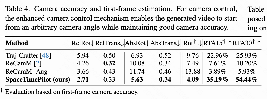 最后,本文评估了前文中详述的摄像机控制机制的有效性。与上述依赖合成地面真实视频的时间重排评估不同,本文构建了一个由 OpenVideoHD组成的真实世界 90 视频评估集,涵盖了各种动态人类和物体运动。每种方法在 20 种摄像机轨迹下进行评估:10 种从与源视频相同的初始姿态开始,10 种从不同的初始姿态开始,总共生成 1800 个视频。本文应用 SpatialTracker-v2从生成的视频中恢复摄像机姿态,并将其与相应的输入摄像机姿态进行比较。为了确保一致的比例,本文对齐了前两个摄像机位置的幅度。轨迹精度使用 RotErr 和 TransErr 根据 [8] 进行量化,采用两种协议:(1)评估相对于第一帧定义的原始轨迹(相对协议,RelRot,RelTrans),以及(2)在与第一帧的估计姿态对齐后进行评估(绝对协议,AbsRot,AbsTrans)。具体来说,本文通过乘以由 DUSt3R估计的生成帧和源第一帧之间的相对姿态来变换恢复的原始轨迹。本文还将此 DUSt3R 姿态与目标轨迹的初始姿态进行比较,并报告 RotErr、RTA@15 和 RTA@30,因为平移幅度是尺度模糊的。