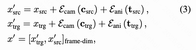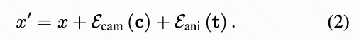 其次,它在数据集上进行训练,其中源视频和目标视频的第一帧总是相同的。后一个限制在本文的训练数据集设计中得到了解决。为了克服前者,本文设计了一种源感知摄像机条件化。本文使用预训练的姿态估计器估计源视频和目标视频的摄像机姿态,并将它们联合注入扩散模型以提供明确的几何上下文。因此,等式 (2) 扩展为: