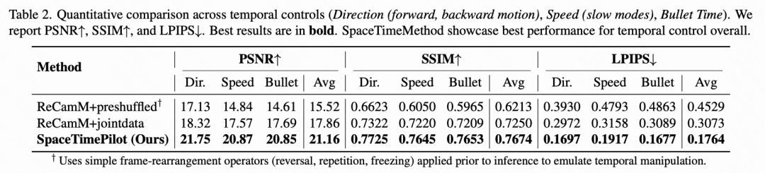 首先,本文评估了模型的时间重排能力。为了排除摄像机控制引起的误差,本文在固定摄像机姿态下对 SpaceTimePilot 进行条件化,仅改变时间控制信号。实验在未公开的 Cam×Time 测试集上进行,该测试集包含 50 个场景,这些场景以密集的全网格轨迹渲染,可以重新计时为任意时间序列。对于每个测试用例,本文使用一个移动摄像机的源视频,但将目标摄像机轨迹设置为第一帧姿态。然后,本文应用一系列时间控制信号,包括反向、子弹时间、之字形、慢动作和正常播放,以合成相应的重定时输出。由于本文拥有所有时间配置的地面真实帧,因此本文报告了感知损失:PSNR、SSIM 和 LPIPS。