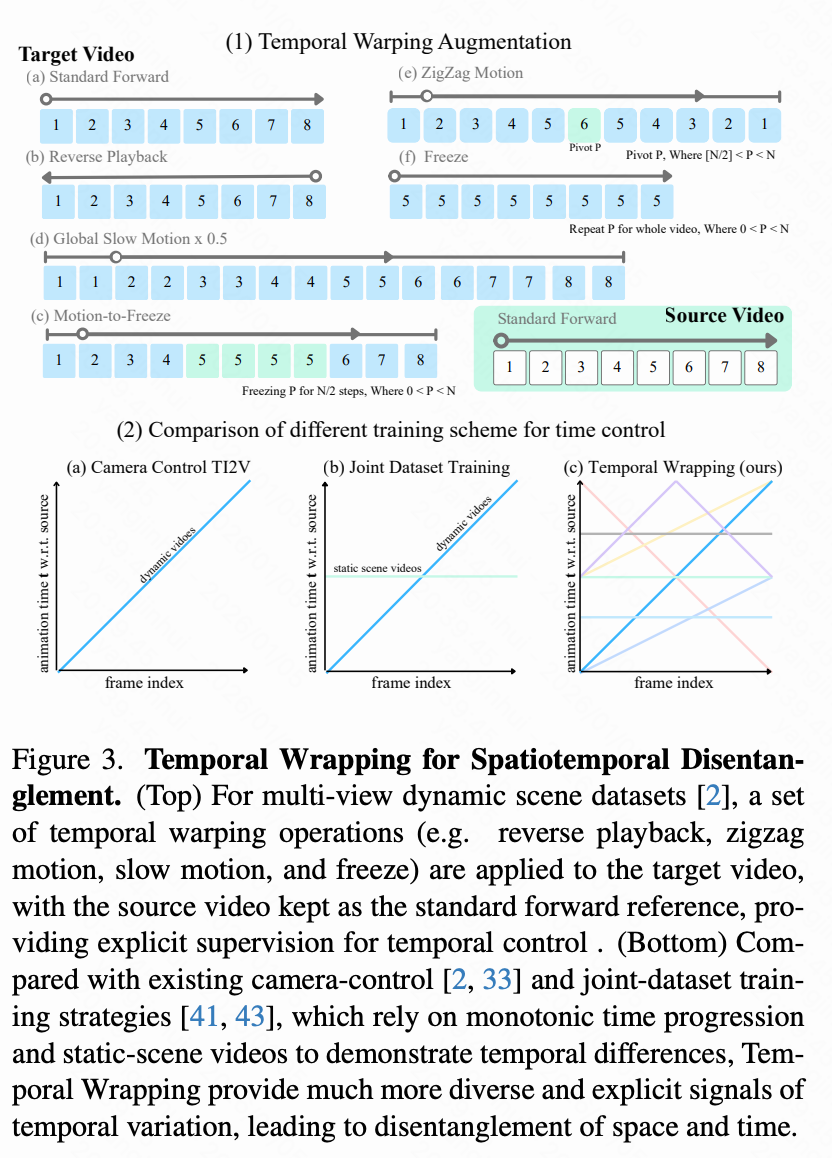 为了在本文的方法中实现时间操作,本文需要包含时间重映射示例的配对训练数据。实现时空解耦进一步需要包含摄像机和时间控制示例的数据。据本文所知,目前没有公开可用的数据集满足这些要求。只有少数先前的工作,例如 4DiM和 CAT4D,尝试解决时空解耦问题。一种常见的策略是在静态场景数据集和多视图视频数据集上联合训练。这些数据集中有限的控制可变性导致时间演变和空间运动之间的混淆,从而导致纠缠或不稳定的行为。本文通过使用时间扭曲增强现有多视图视频数据并提出新的合成数据集来解决这一限制。