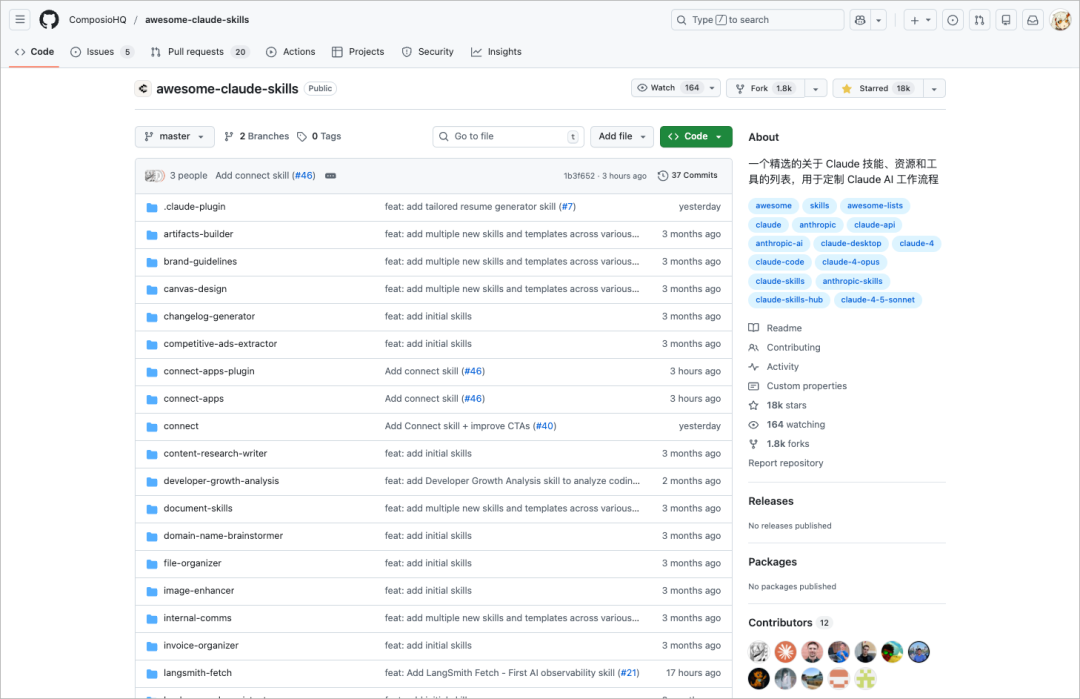 比如这个这个包含50多个Claude技能的仓库,已经18K了。