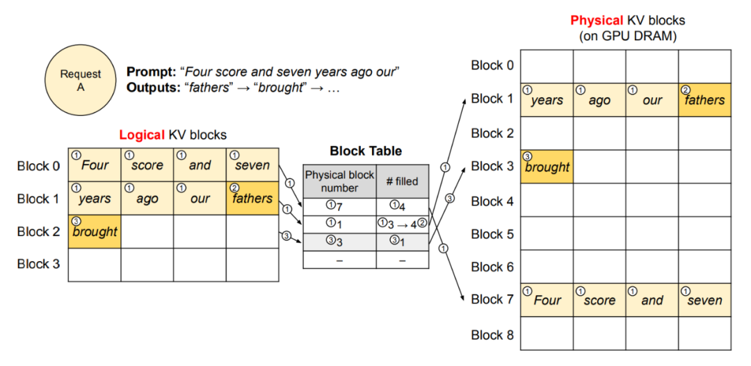 对于逻辑内存中的 Block 0 和Bolck 1,通过映射表,将对应的KV cache值存储到不连续的物理内存 Block 7和Block 1中。进而实现了在虚拟的逻辑内存中每个token 的内存是连续的,而在物理内存中却是不连续的。