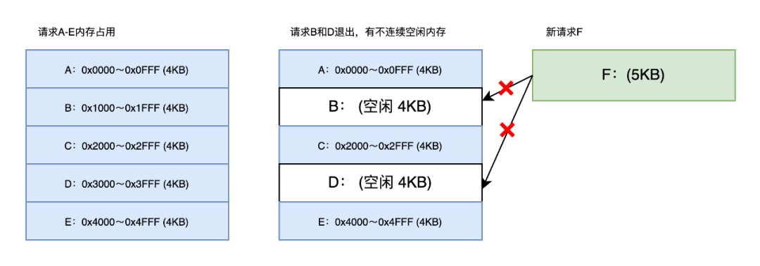 新进程F请求加载失败:进程F需要5 KB 的连续内存,虽然总空闲内存足够 (8 KB>5KB),但两段空闲块均小于5KB (每段仅4 KB),因此操作系统无法分配连续5 KB的空间,导致进程F加载失败。