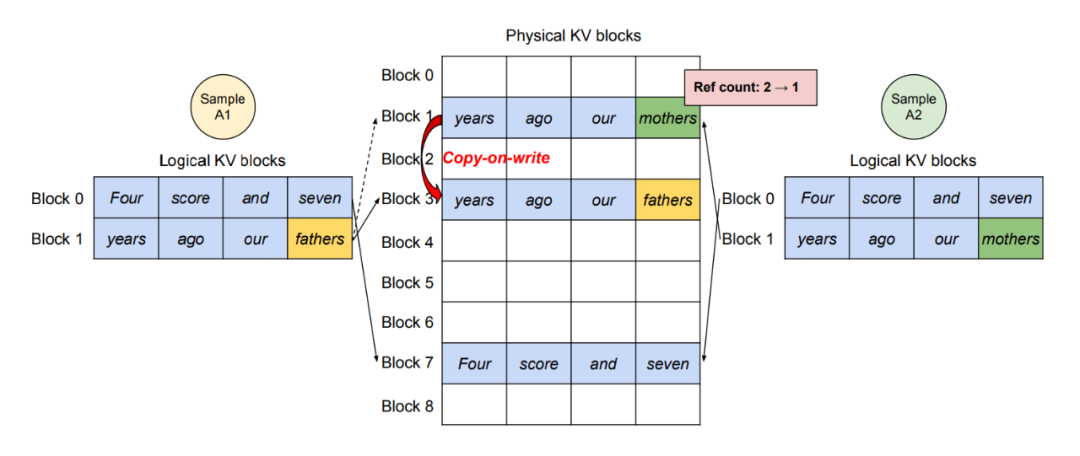 多个输出序列共享同一份prompt的 KV cache,避免重复存储。如上图请求A1和请求A2有共同的提示词,所以A1和A2的逻辑内存中Block 0 和Block 1 共享物理内存Block 7 和 Block 1。因为物理内存中的同一个Block可以对应逻辑内存中多个不同的Block,所以采用引用计数(reference count),即此时物理内存中共享的 Block 7和Block 1 的引用计数都为2。