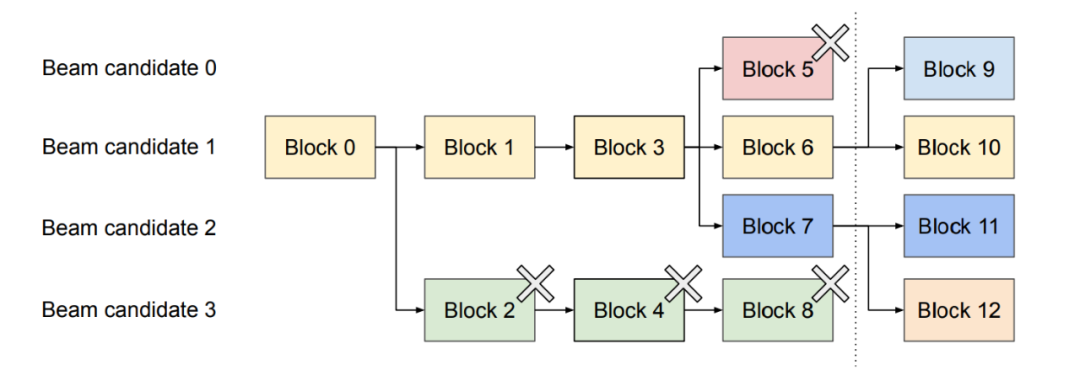 在生成第4个Block时候,候选 Beam candidate 0 和 5,不再符合阈值要求被剪枝,此时其占用的Block(Block2,4,8和5)被释放。在虚线之后又有新的token产生,Block 9 至Block 12 为生成新的候选。