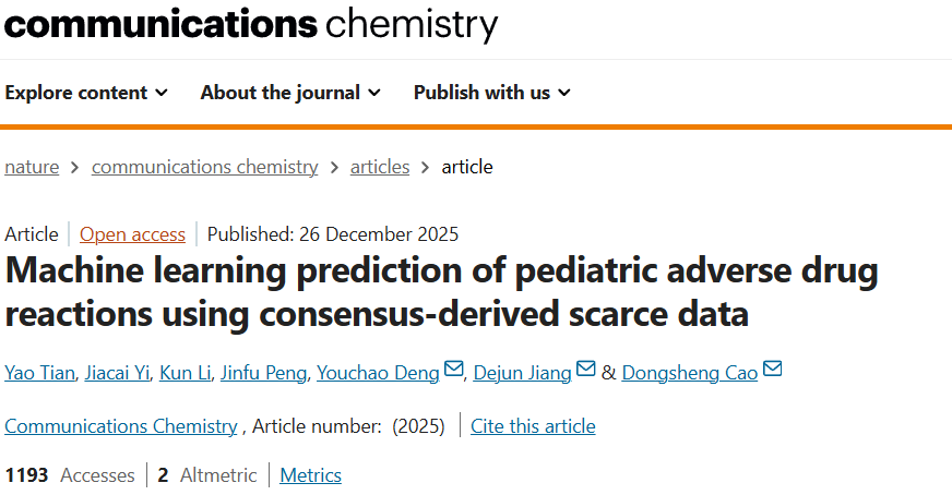 儿童并非成人的缩小版,其独特的生理发育特点决定了他们在用药时面临着与成人截然不同的安全风险。药物不良反应(ADRs)是导致儿童患病和死亡的重要原因,但当前儿科药物安全研究却因临床数据匮乏和过度依赖成人研究而存在巨大证据缺口。中南大学湘雅药学院曹东升教授、蒋德军副教授、邓友超副教授团队开发了一套专门针对儿童群体的药物不良反应预测计算框架,研究成果已发表在国际权威期刊《Communications Chemistry》(中科院1区Top)上。该研究整合了共识驱动的信号检测、多层次生物学特征和可解释的机器学习方法,为儿科药物安全评估提供了创新性的解决方案。