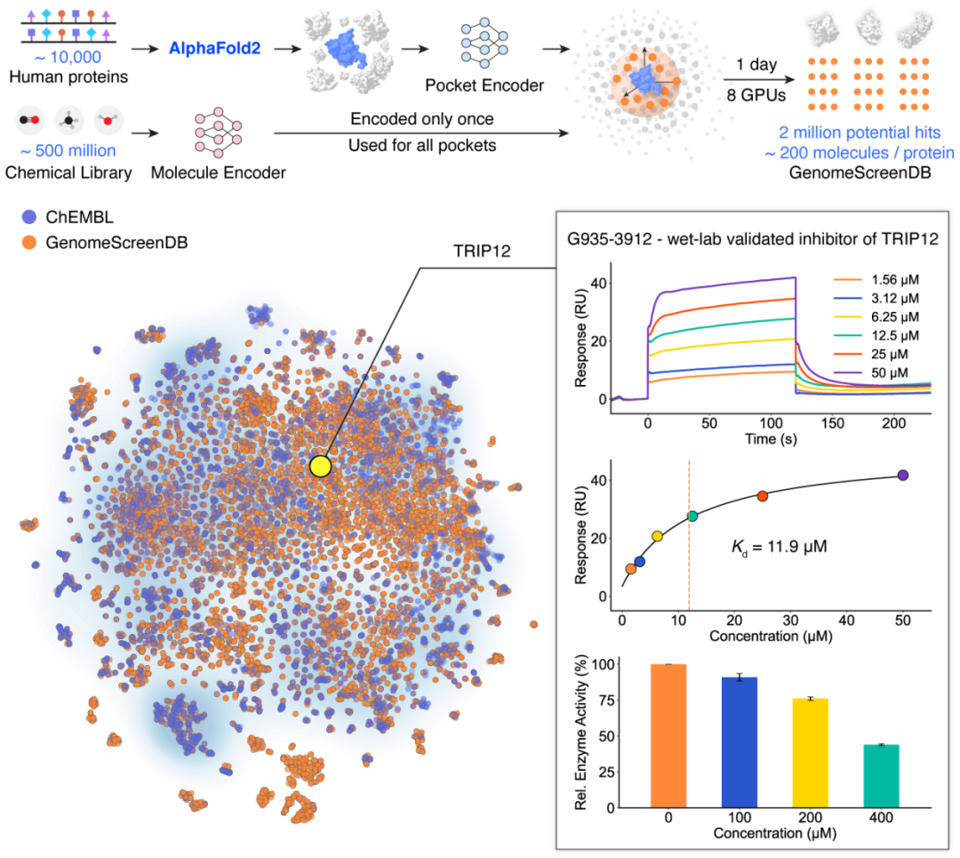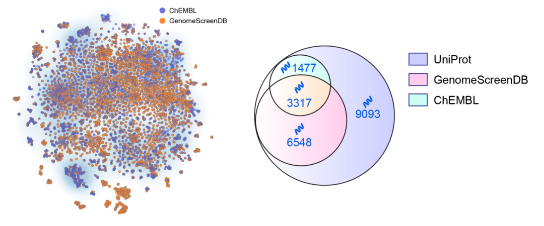 人类基因组规模筛选项目覆盖的蛋白数目与现有数据库对比(左:覆盖的靶蛋白空间,使用ESM1b编码并进行t-SNE降维可视化;右:覆盖的UniProt ID数量)