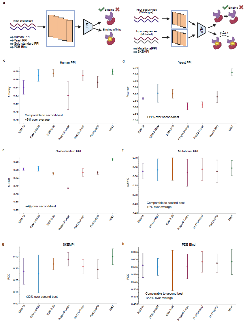 在二分类 PPI 预测、结合亲和力回归以及突变效应预测等标准任务中,MINT 在多个数据集上持续优于现有蛋白语言模型。即使与参数规模更大的通用模型相比,MINT 仍表现出明显优势,说明针对 PPI 的结构化建模比单纯扩大模型规模更为关键。