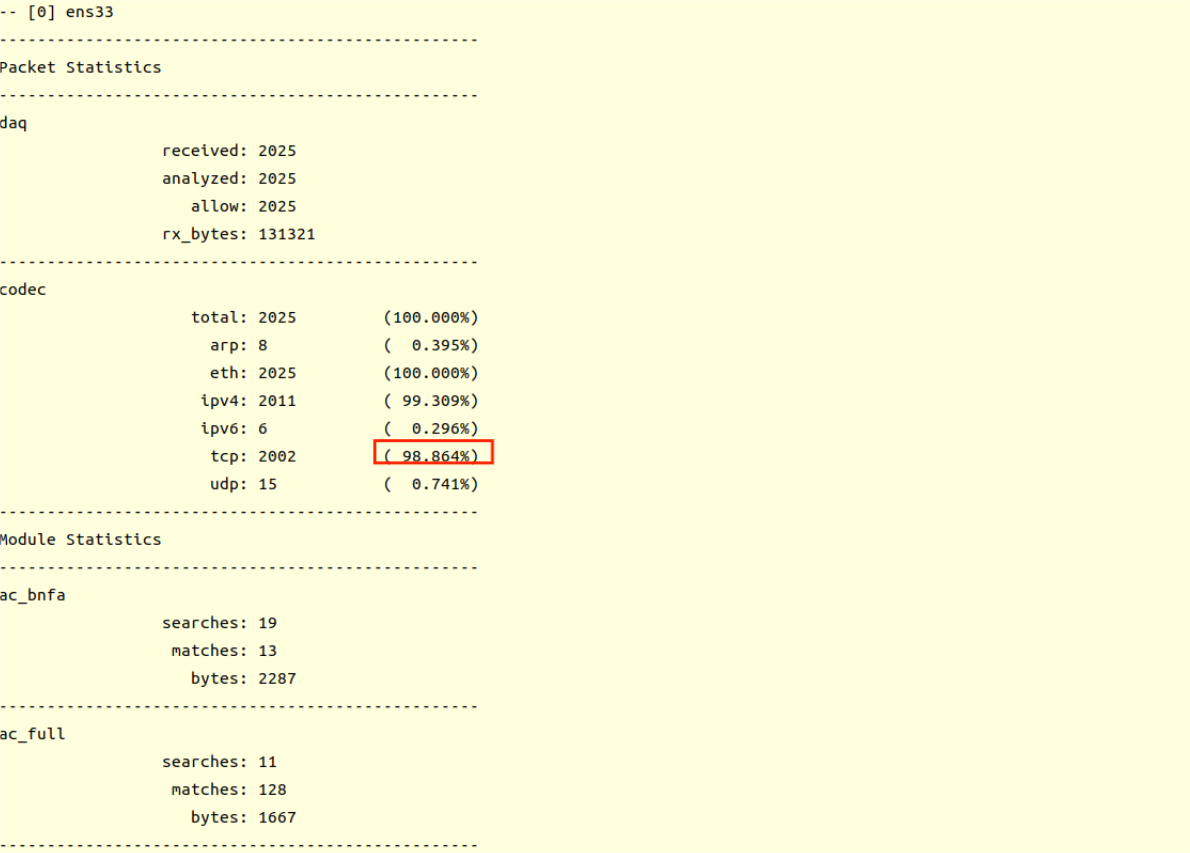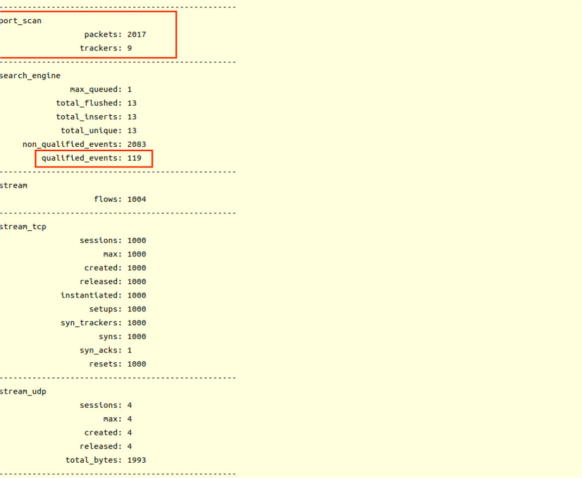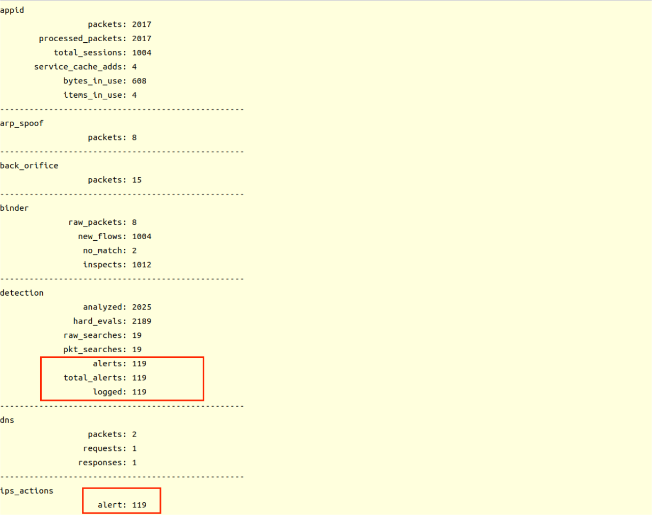 - detection: 检测模块,一共分析了2025个数据包,产生了119个警报,并且这119个报警都被记录在日志中。。